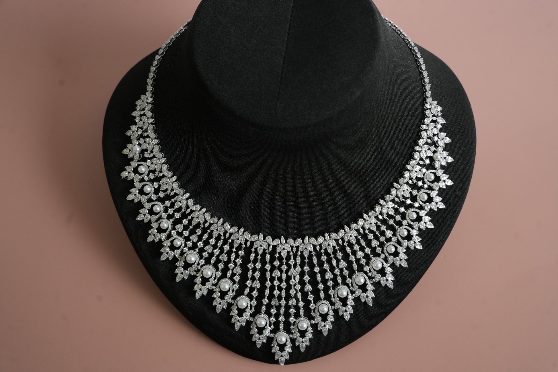 A graceful blend of delicate craftsmanship and classic beauty, this necklace features cascading strands adorned with luminous pearl accents. The intricate lattice design adds texture and movement, creating a soft yet striking statement around the neckline. Perfect for weddings, formal gatherings, or traditional ensembles that celebrate elegance with subtle charm.